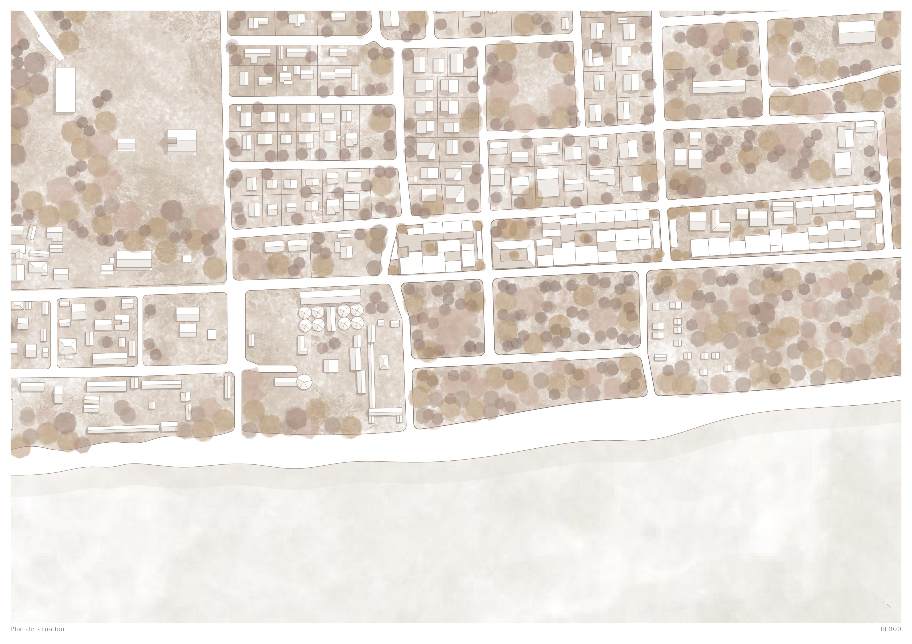 Das Projekt ermöglicht eine etappenweise Umsiedlung auf ein benachbartes Grundstück mit dem Ziel, bestehende Nachbarschaften und Bindungen zu bewahren. Daraus entsteht ein dichtes Ǫuartier mit einem kinderfreundlichen Gefüge aus öffentlichen, halböffentlichen und privaten Räumen, Gärten und ruhigen Straßen. Dem Entwurf liegt ein Wohnmodell zugrunde, das sich im Laufe der Zeit an unterschiedliche Bedürfnisse anpasst. In der Planungsphase wird eine Vielzahl typologischer Grundformen entwickelt – von Einzimmerwohnungen bis hin zu Einheiten mit vier Zimmern –, um eine möglichst grosse Bandbreite an sozialen Realitäten abzubilden. Diese Vielfalt ist Teil des Konzepts, um soziale Durchmischung zu fördern und gemeinschaftlichen Zusammenhalt zu stärken. Mit Klarheit und Umsicht begegnet das Projekt einer extremen Ausgangslage – ohne sie zu vereinfachen – und formuliert eine lokal verankerte, konkret umsetzbare und übertragbare Antwort auf eine globale Herausforderung. Es versteht Wohnen als kollektiven Prozess, in dem Autonomie, Solidarität, Erinnerung und Entwurf zu einem zukunftsfähigen Modell zusammenfinden.