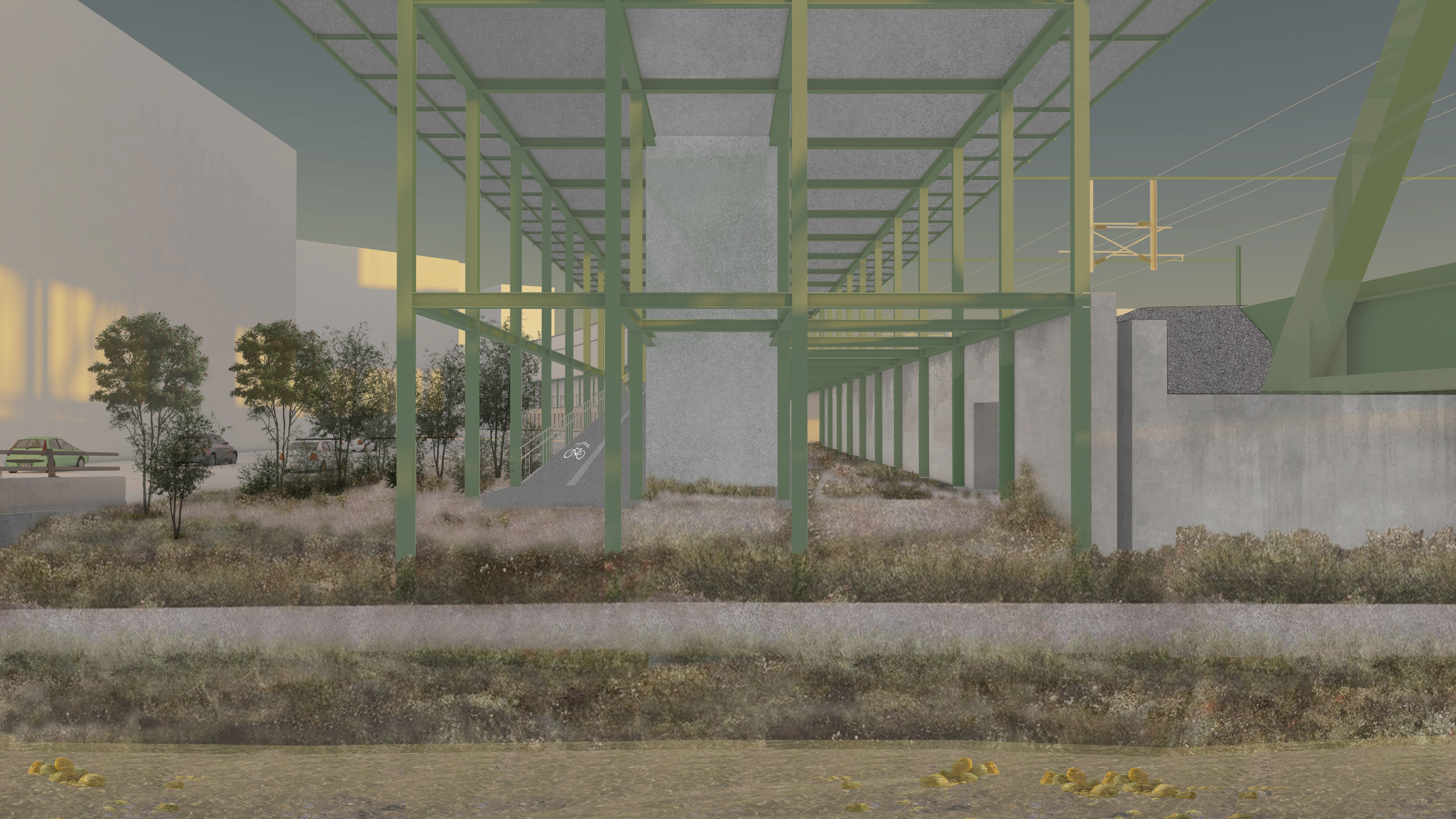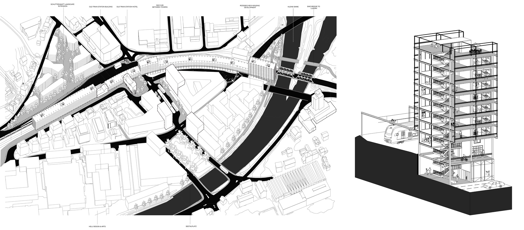 Diese Arbeit wirft ein optimistisches Licht auf die städtebauliche Transformation von Emmenbrücke. Im Zentrum steht die Frage nach den grundlegenden Werten dieser neuen Siedlungen: weg von blosser Gewinnmaximierung und sozialer Fragmentierung hin zu einem Ansatz, der den sozialen Mehrwert und städtebaulichen Nutzen – im Sinne einer Stadtrendite – in den Vordergrund stellt. Indem sie individuelle Ambitionen überwindet und deren Mechanismen auf öffentliche Relevanz umlenkt, verwandelt ihre Vision bislang isolierte Neubauten und Restflächen entlang der Gleise in ein Netzwerk aus vielfältigen, miteinander verbundenen Räumen und Wegen. Ein durchgehendes gemeinschaftliches Sockelgeschoss – mit öffentlichen Arkaden und Galerien – verknüpft die Flussräume an Reuss und Kleine Emme mit dem Bahnhof und macht sie für Fussgänger:innen und Radfahrer:innen zugänglich. Auf diesem gemeinsamen Fundament erheben sich präzise gesetzte Wohngebäude, die einen erheblichen Anteil an bezahlbarem und anpassungsfähigem Wohnraum bieten – eine Wohnform, die in Luzern und Umgebung dringend benötigt wird.