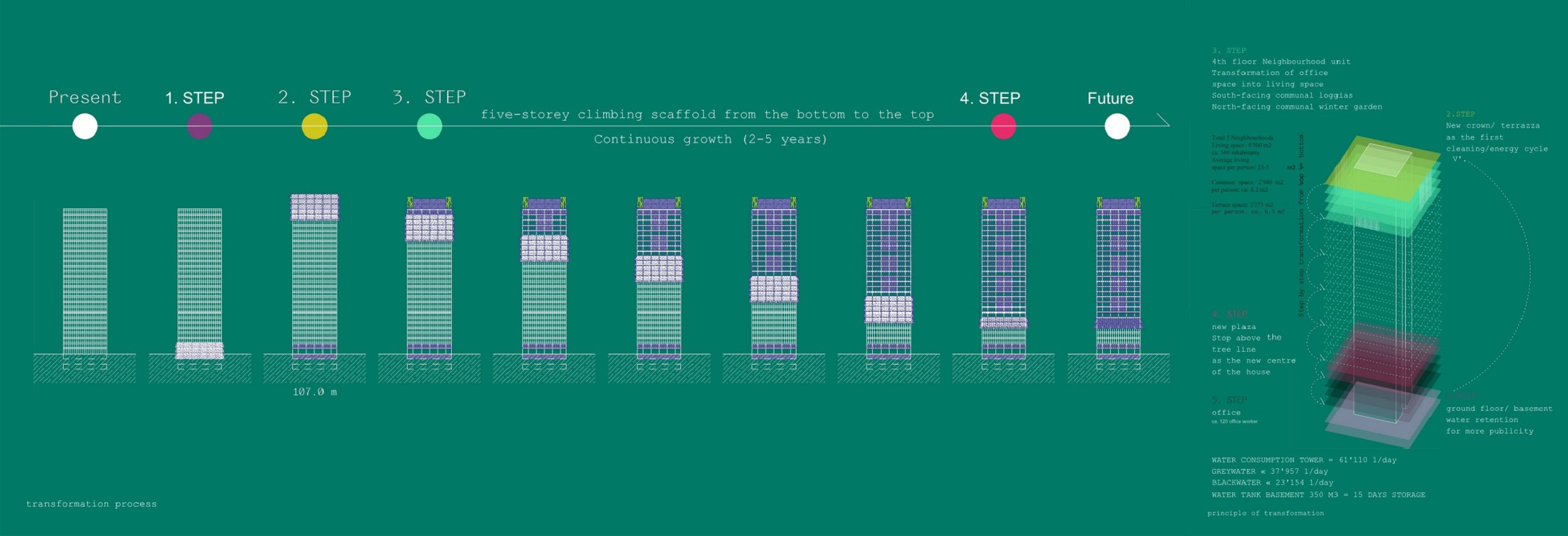 Ausgangspunkt ist die intensive Auseinandersetzung mit dem besonderen Charakter des Westquais in Basel – ein Ort, geprägt von industrieller Nutzung, ephemeren Architektur und stetigem Wandel. Aus dieser Beobachtung entwickelt sich das Leitbild eines „Lagers für Räume“ – ein flexibles, dynamisches städtebauliches Konzept, das dem Ort gerecht wird und Zukunftsperspektiven eröffnet. Es gelingt der Arbeit, vorhandene Strukturen aufzugreifen und weiterzudenken. Die Blockrandstruktur des angrenzenden Klybeckquartiers wird aufgenommen, öffnet sich jedoch in Richtung Rhein. Silos bleiben als identitätsstiftende Hochpunkte erhalten. Neue Verbindungen – insbesondere die Brücke nach Frankreich und die Verbindung zum Ostquai – verankern die Insel in ihrer Umgebung. Der Lagerplatz zwischen den Silos wird als wandelbarer, offener Raum erhalten.